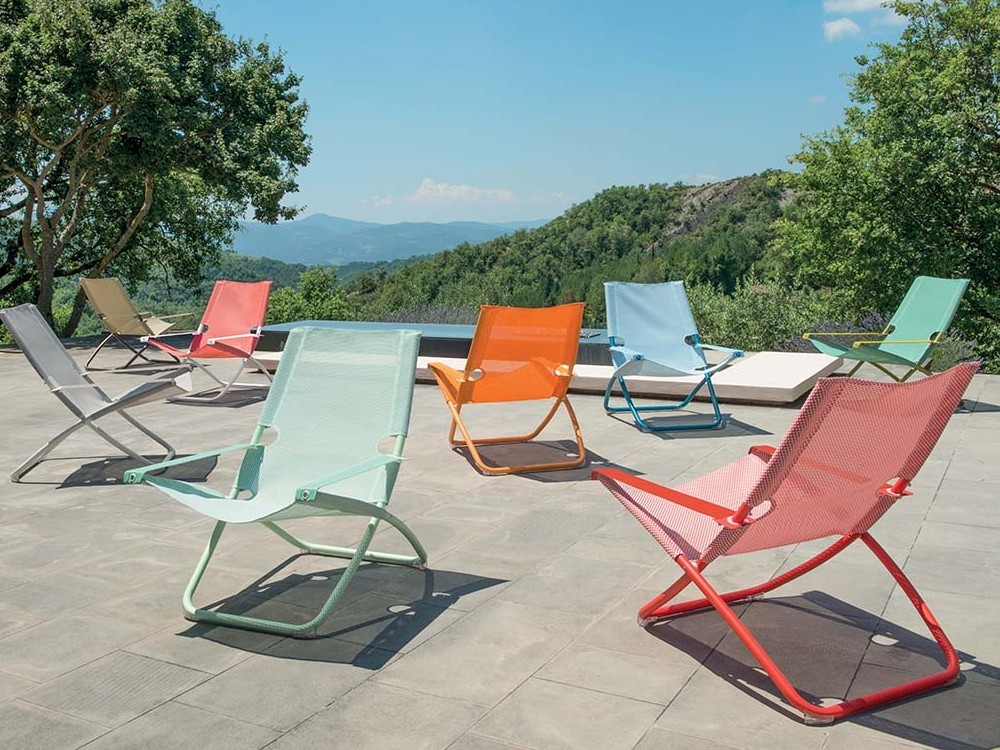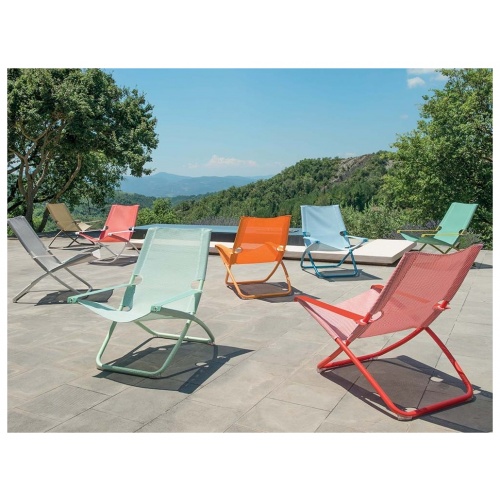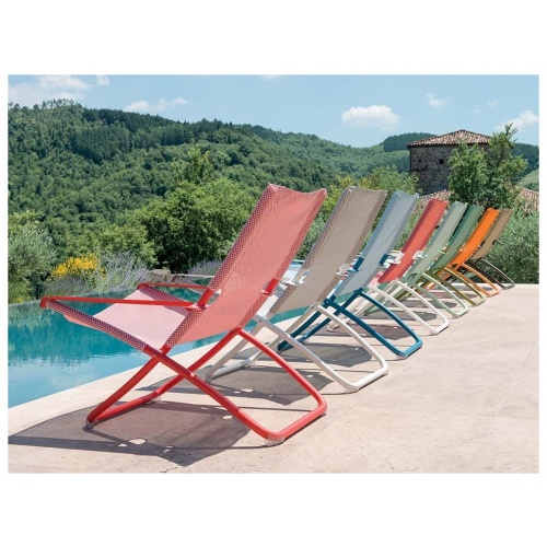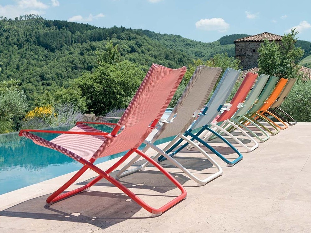 Snooze fully interprets the classic deckchair thanks to its generous and enveloping dimensions and is available in various colourful versions which add a touch of liveliness to every setting.