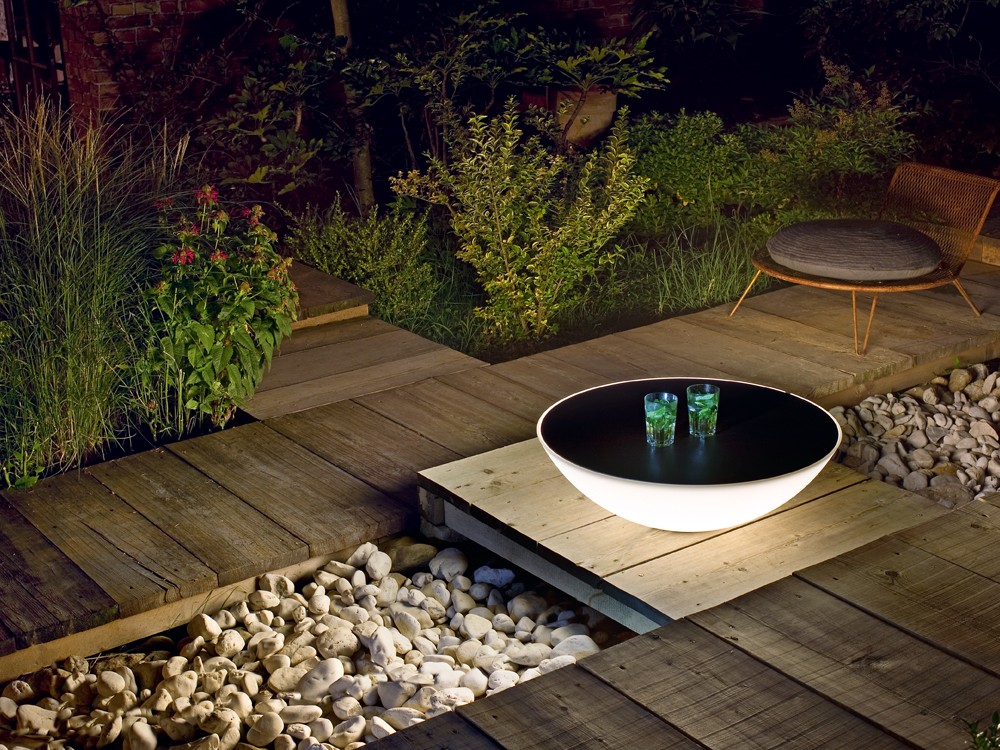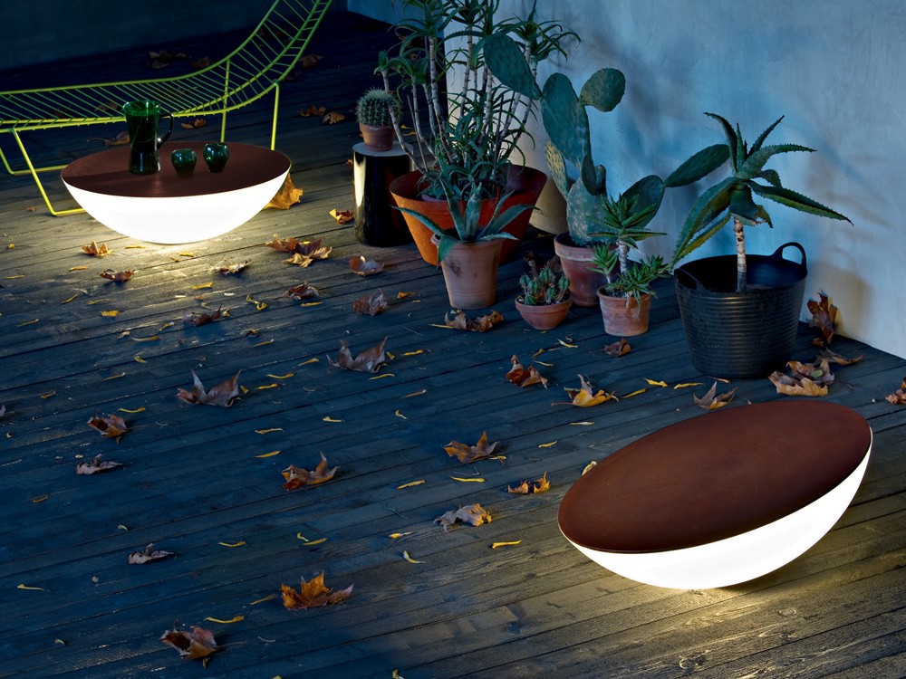 This large outdoor floor lamp by Jean-Marie Massaud features an expansive porcelain top that can practically double as a side table, thus providing you with diffused light as well as a centrepiece for the garden.