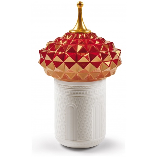 The covers are painted in different tones of red with a gold lustre finish. The candle vases are made of translucent porcelain, which filters the passage of light.