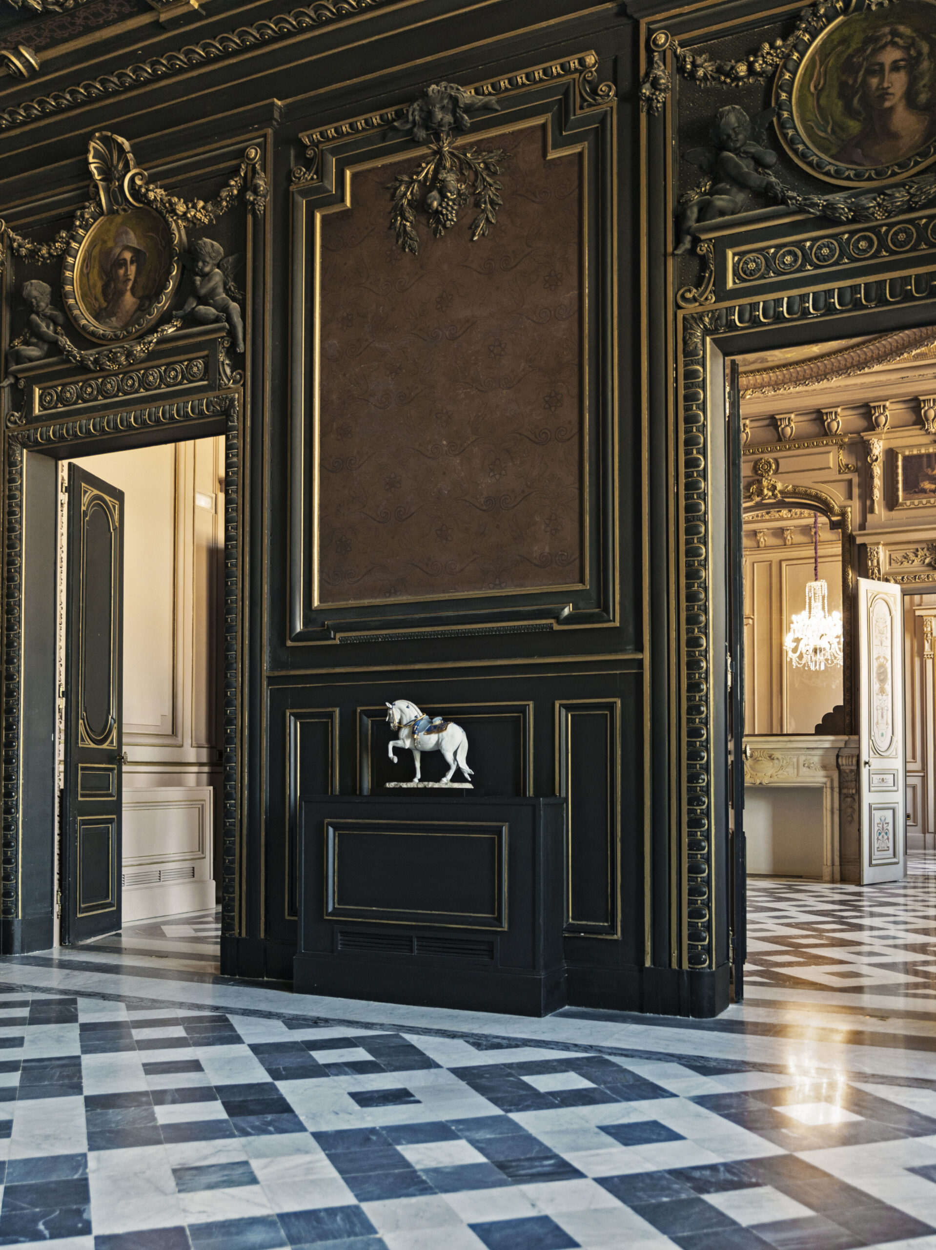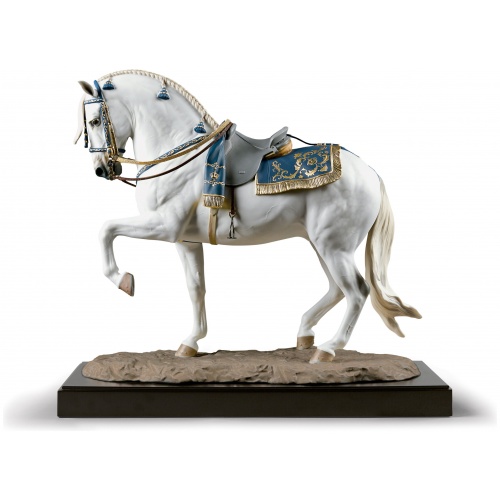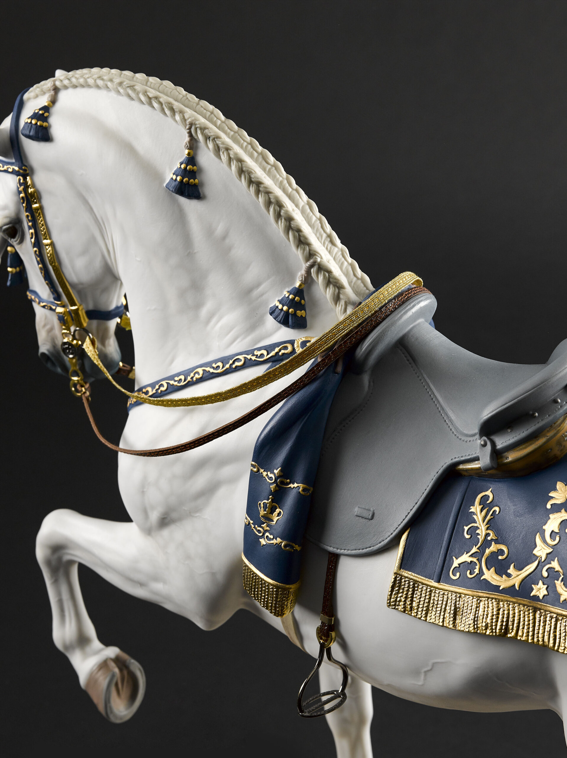 Faithfully inspired by the examples at the Royal Andalusian School of Equestrian Art, the Spanish horse represents one of the most prestigious and admired breeds in the world of horsemanship. The elegance, nobility and beauty of these horses is portrayed in this limited edition sculpture with great anatomical precision and adorned with extraordinary decorative work. The bridle, chest, saddle and blanket are richly decorated with golden lustre, while the bite and stirrups are made of gold-plated brass, with one of the reins and stirrups of natural leather. The intense blue and gold star in the exquisitely decorated harnesses, in contrast with the whiteness of the skin of this magnificent specimen which, while so naturally executing an exhibition step, demonstrates all the elegance of a Spanish thoroughbred.