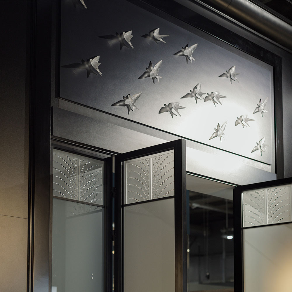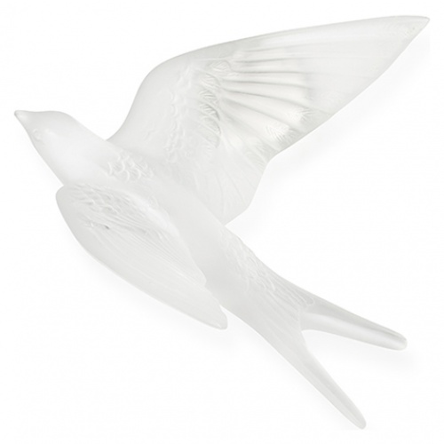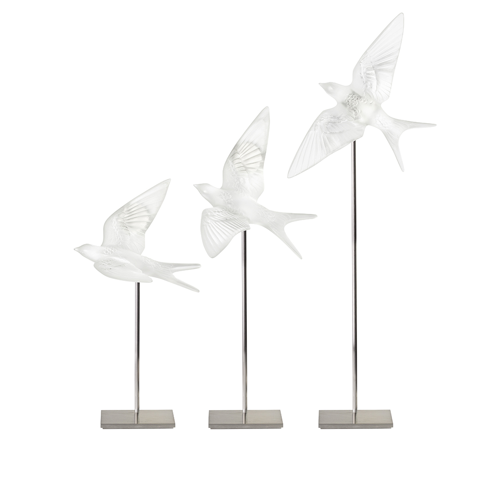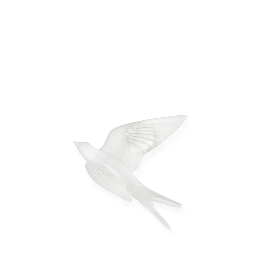 Fashioned in satin-finished and re-polished crystal, emblematic of Lalique, the swallows with a magnet can be juxtaposed in a graphic play on repetition.
