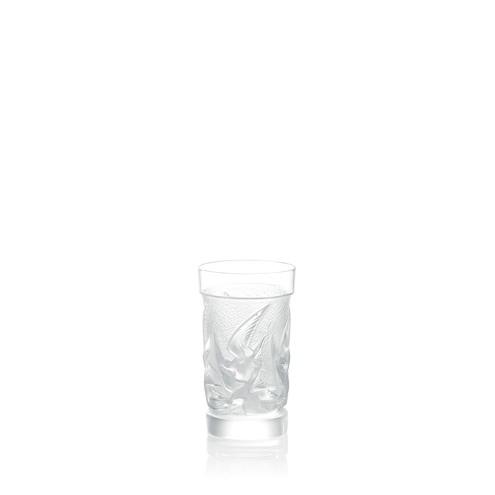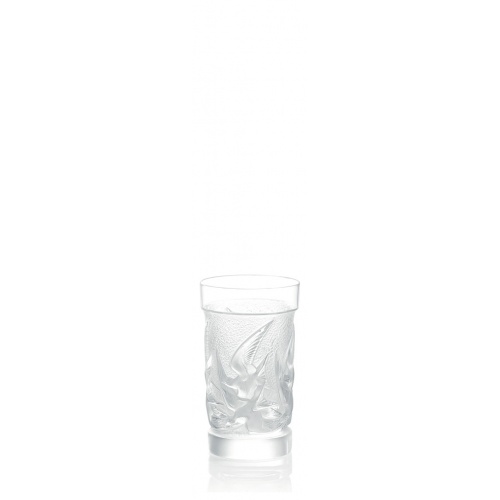 Satin-finished Swallows spread their wings in flight against a textured background and form a graceful motif for the Old Fashioned glass and tumbler in this crystal service.