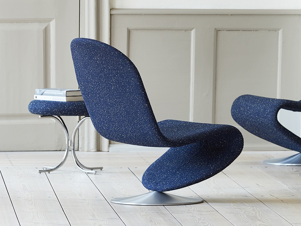 Modern S-shaped low swivel lounge chair fully upholstered with some of Kvadrat’s most exquisite fabrics designed by the Belgian trend-setter, Raf Simons.