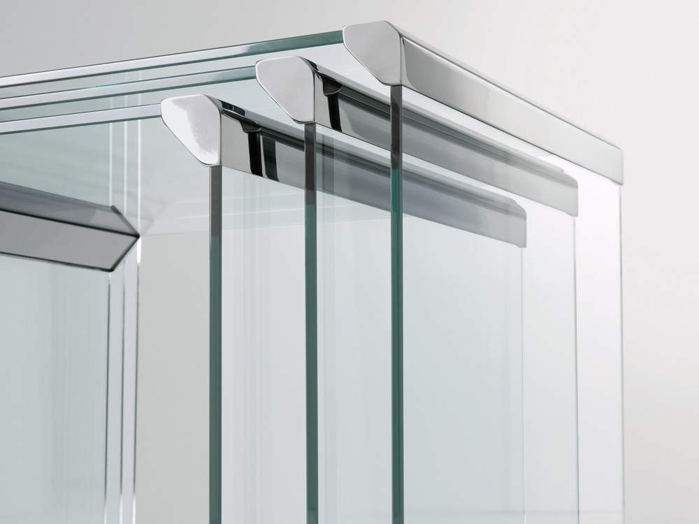 Set of 3 nesting tables which elegantly fit over each other, crafted from transparent glass with metal accents.