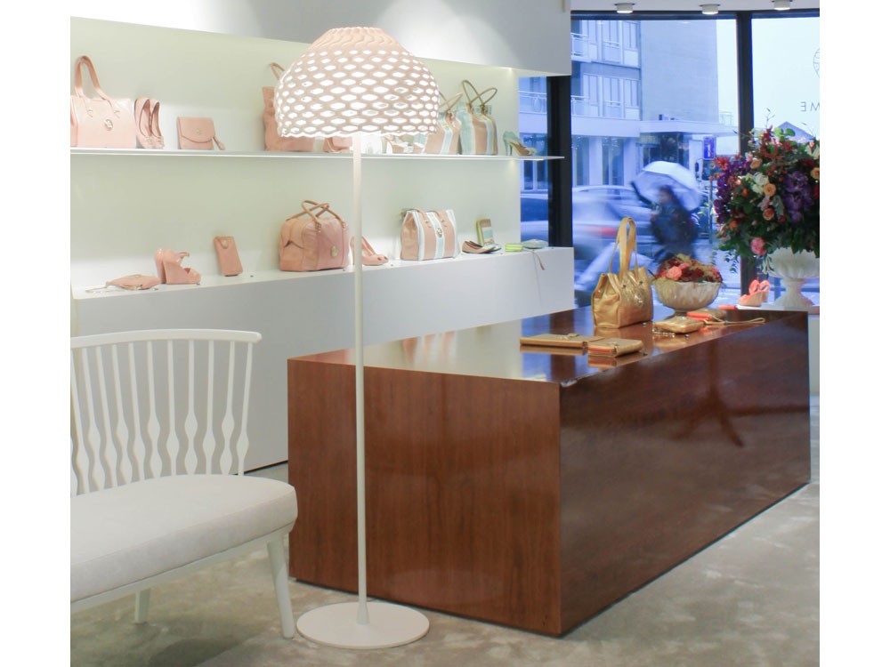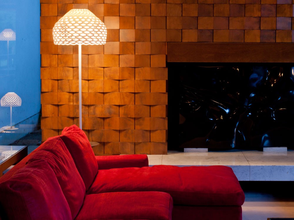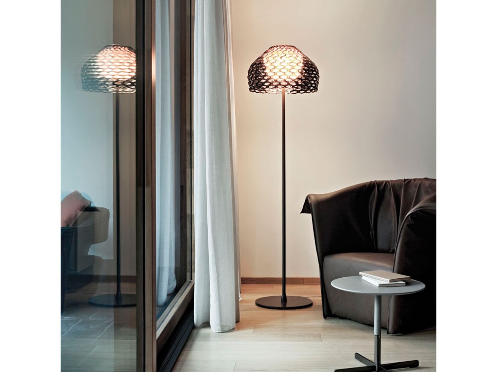The Tatou Floor Lamp by Patricia Urquiola is an elegant table lamp crafted from polycarbonate which features a geometric shade reminiscent of Japanese armor.
