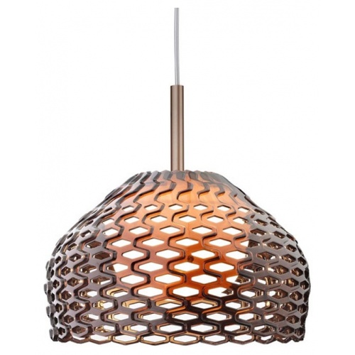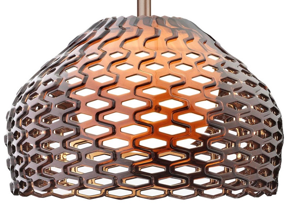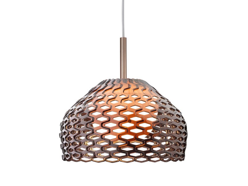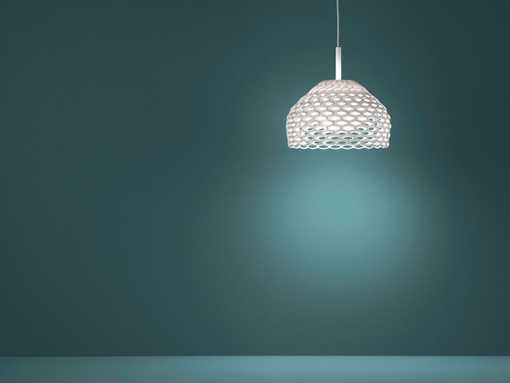 The Tatou Pendant Light by Patricia Urquiola features a shade crafted from polycarbonate which has a geometric shade reminiscent of Japanese armor.