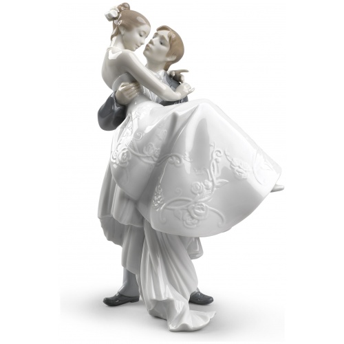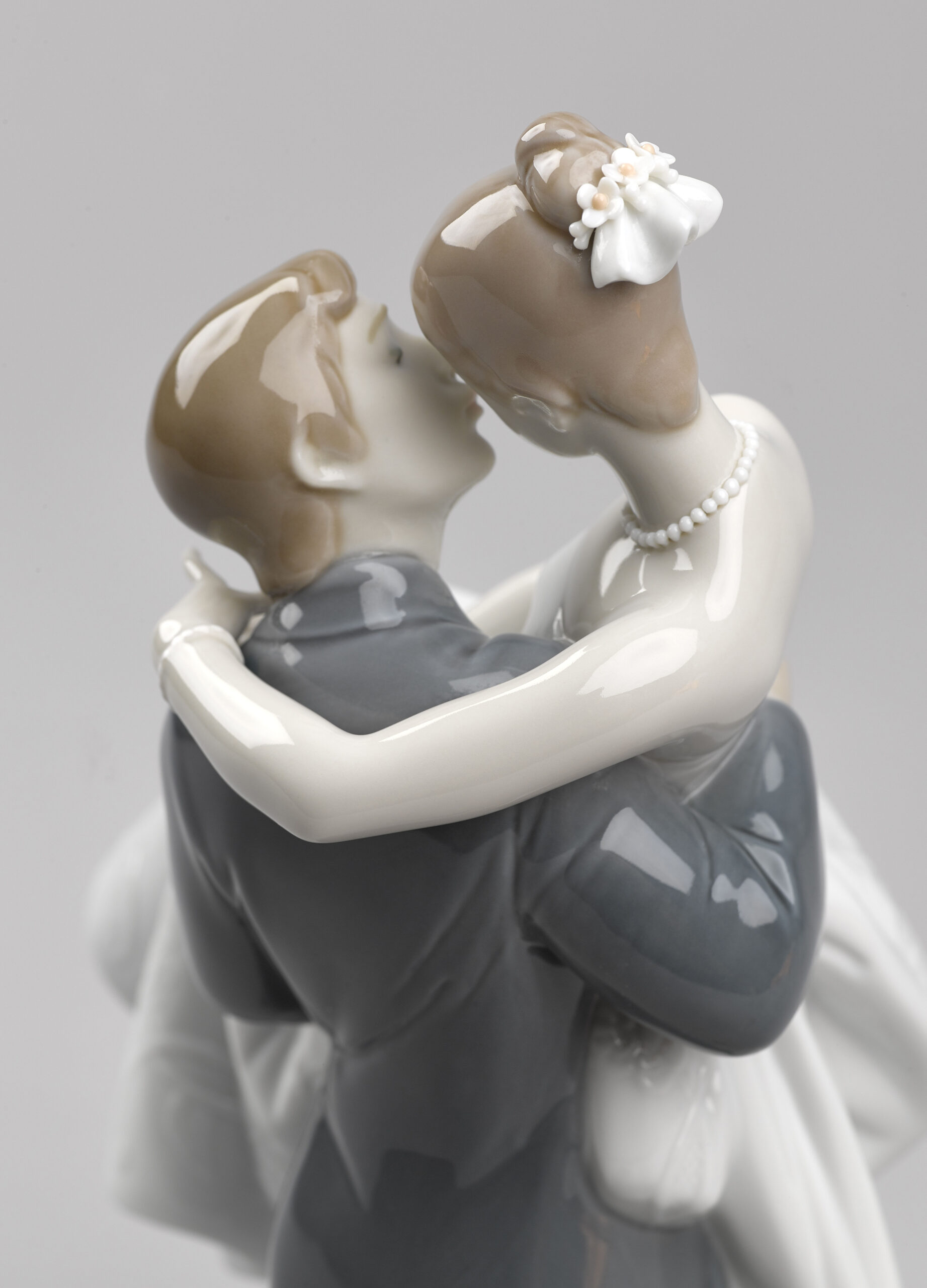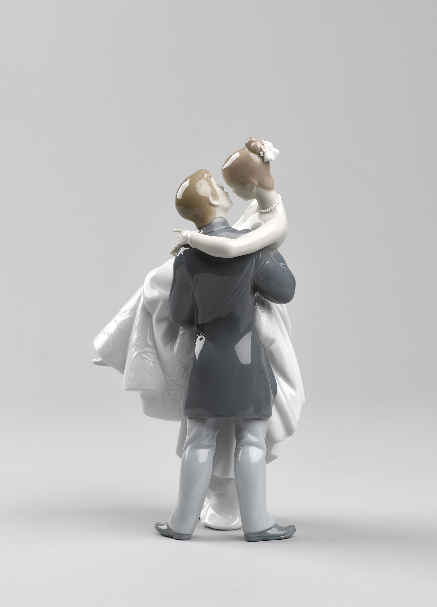 They have finally begun their life together. As tradition dictates, he picks her up in his arms to cross the threshold of the new home, where they hope to make all their dreams come true. A piece of glossy porcelain full of movement in which attention is paid to the smallest detail, particularly in the bride’s dress, which recreates beautiful embroidery work. The pearl necklace and earrings also stand out in this perfect creation as a forever memento of a special moment.