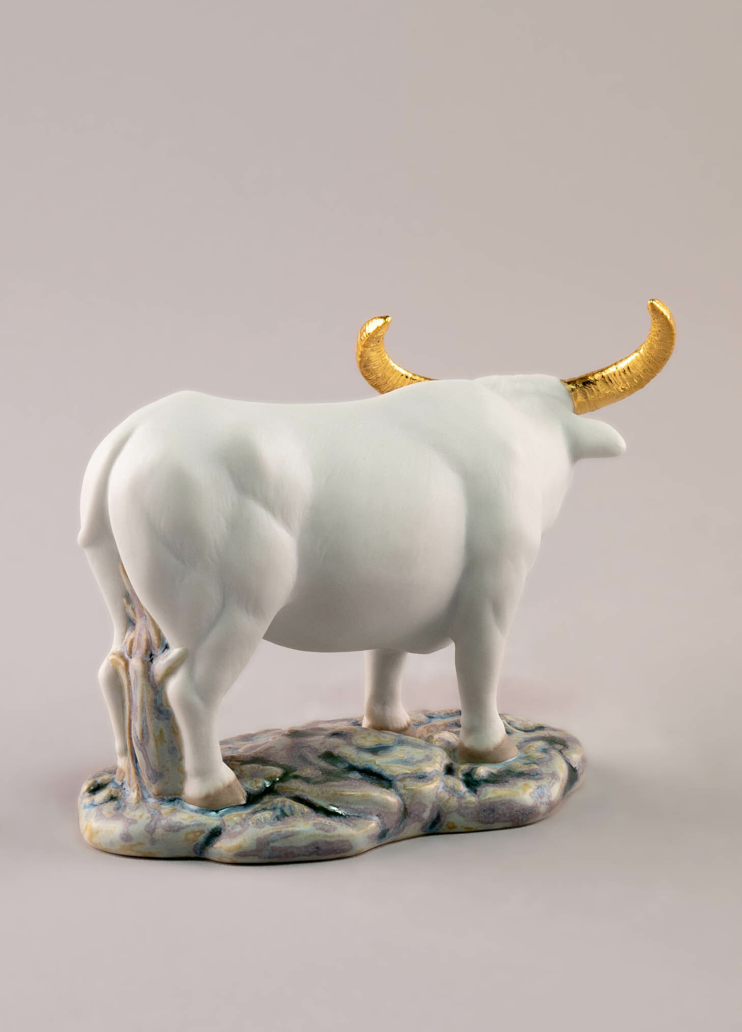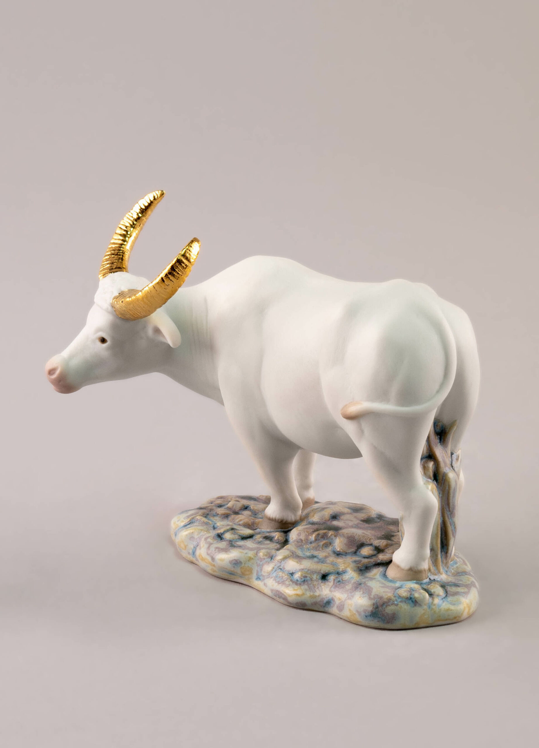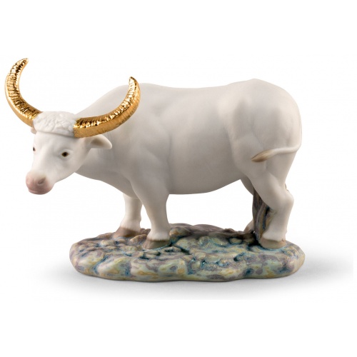 This mini Ox is made in matte white porcelain. The decoration uses golden luster to paint the horns and enamels for the base, the snout and the hoofs. A small-size representation with all the details. A perfect gift for a person born in the year of the Ox in the Chinese zodiac.