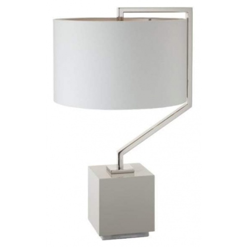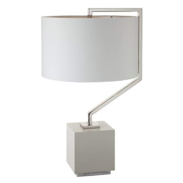 - The edgy design of the Cyclone nickel finish table lamp holding a fabric shade gives it heads up in the designer position that it is placed.