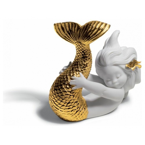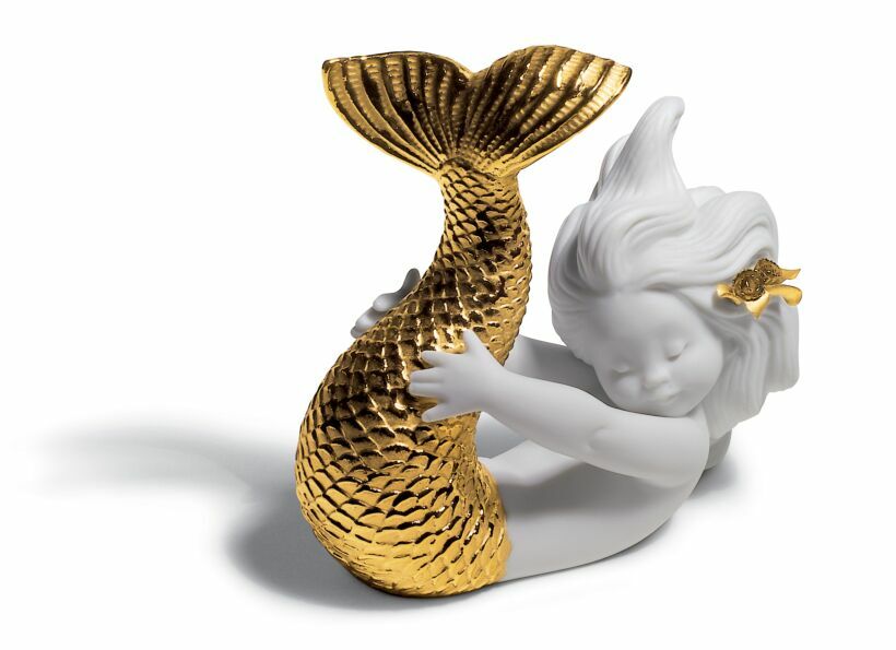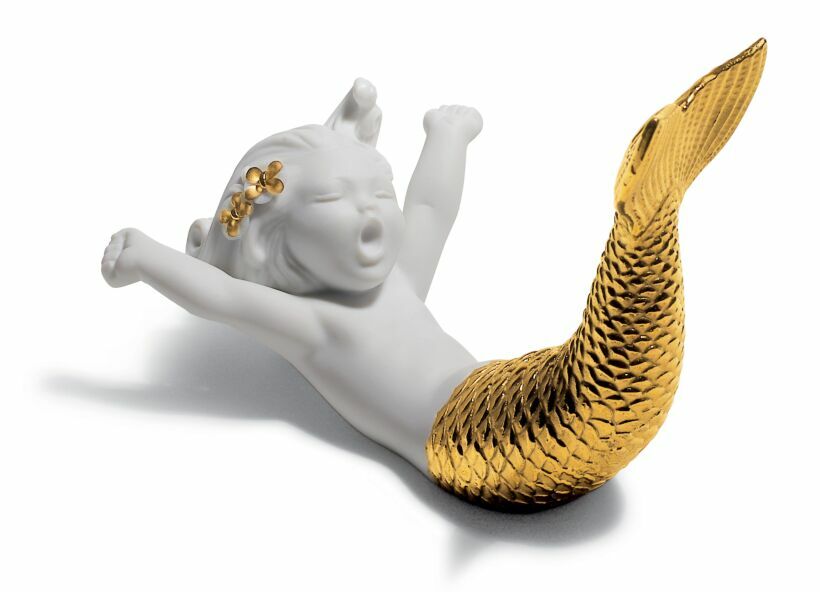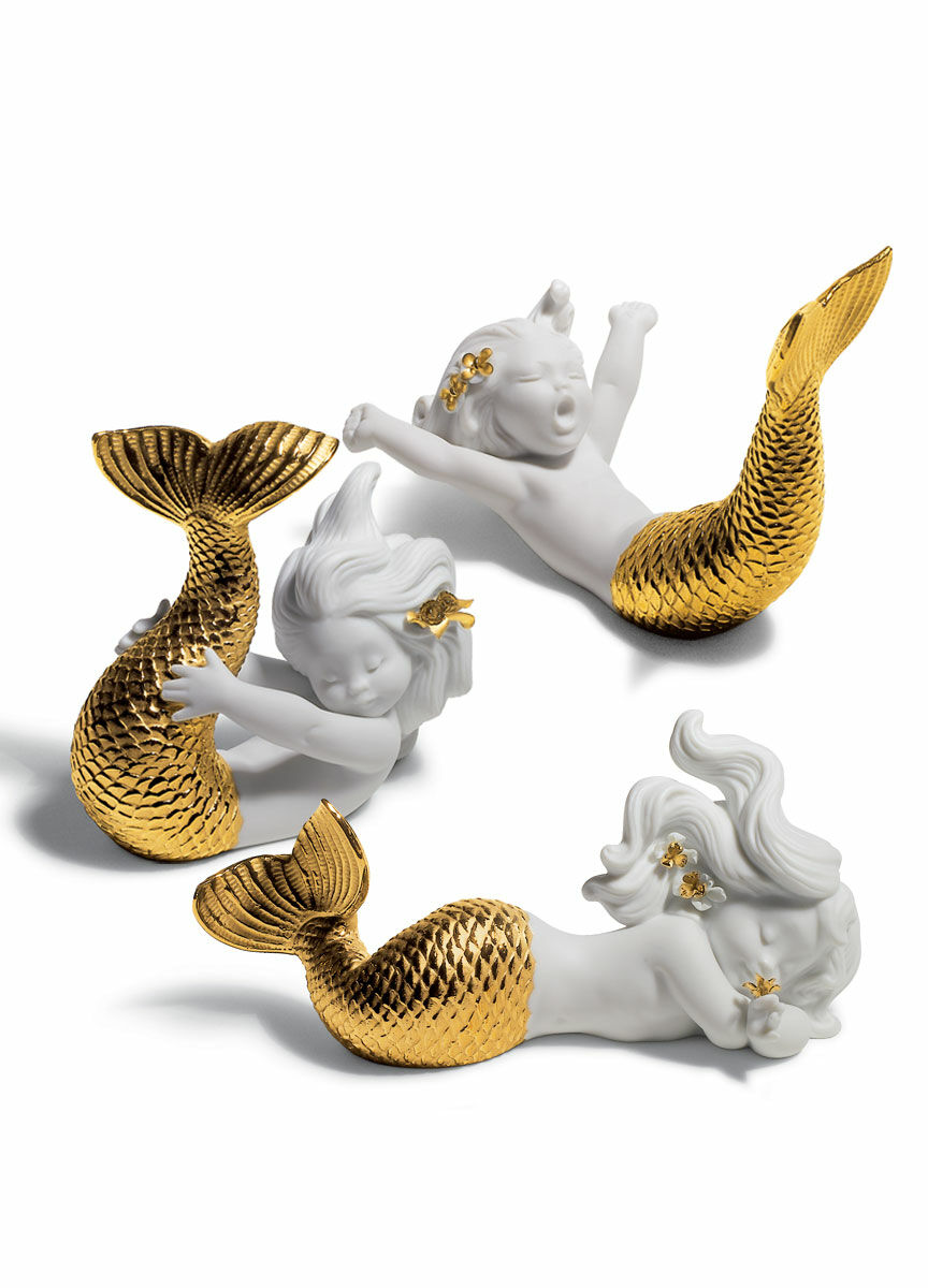 Three porcelain pieces inspired by one of the most fascinating creatures of the sea. These charming little mermaids are given a much more contemporary feel thanks to the contrast between the matte white porcelain finish and the lustre that highlights her tail and the flowers in her hair.
