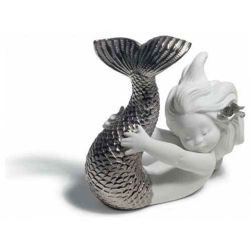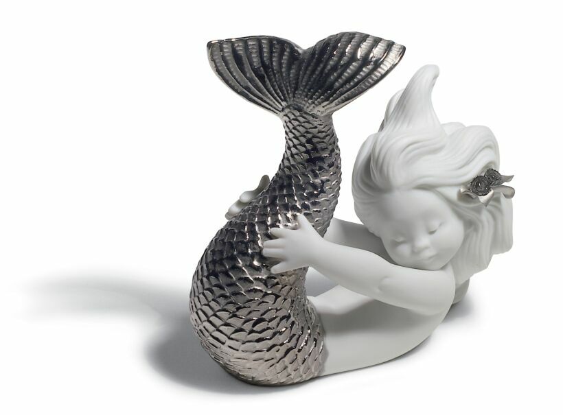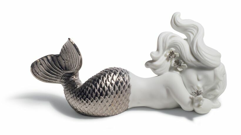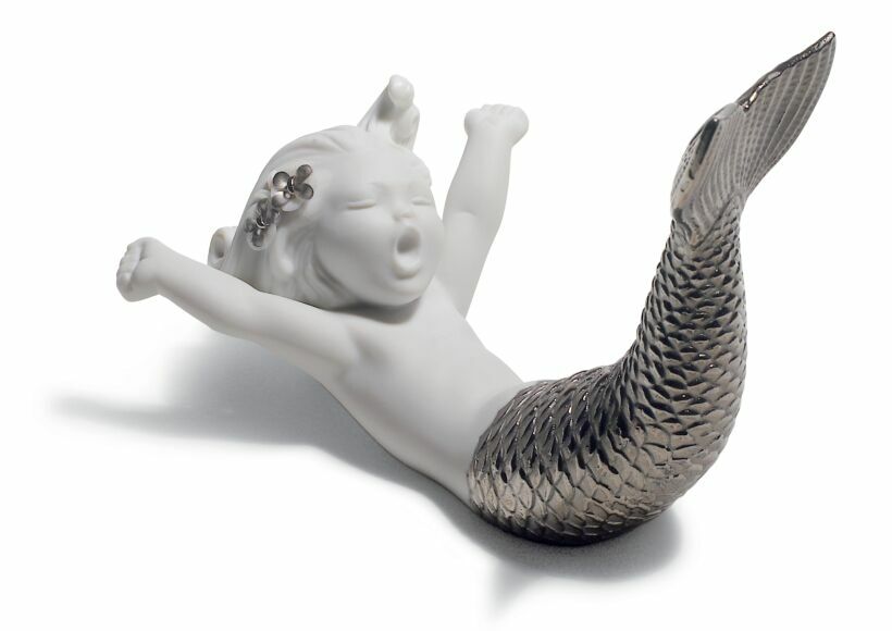 Three porcelain pieces inspired by one of the most fascinating creatures of the sea. These charming little mermaids are given a much more contemporary feel thanks to the contrast between the matte white porcelain finish and the lustre that highlights her tail and the flowers in her hair.