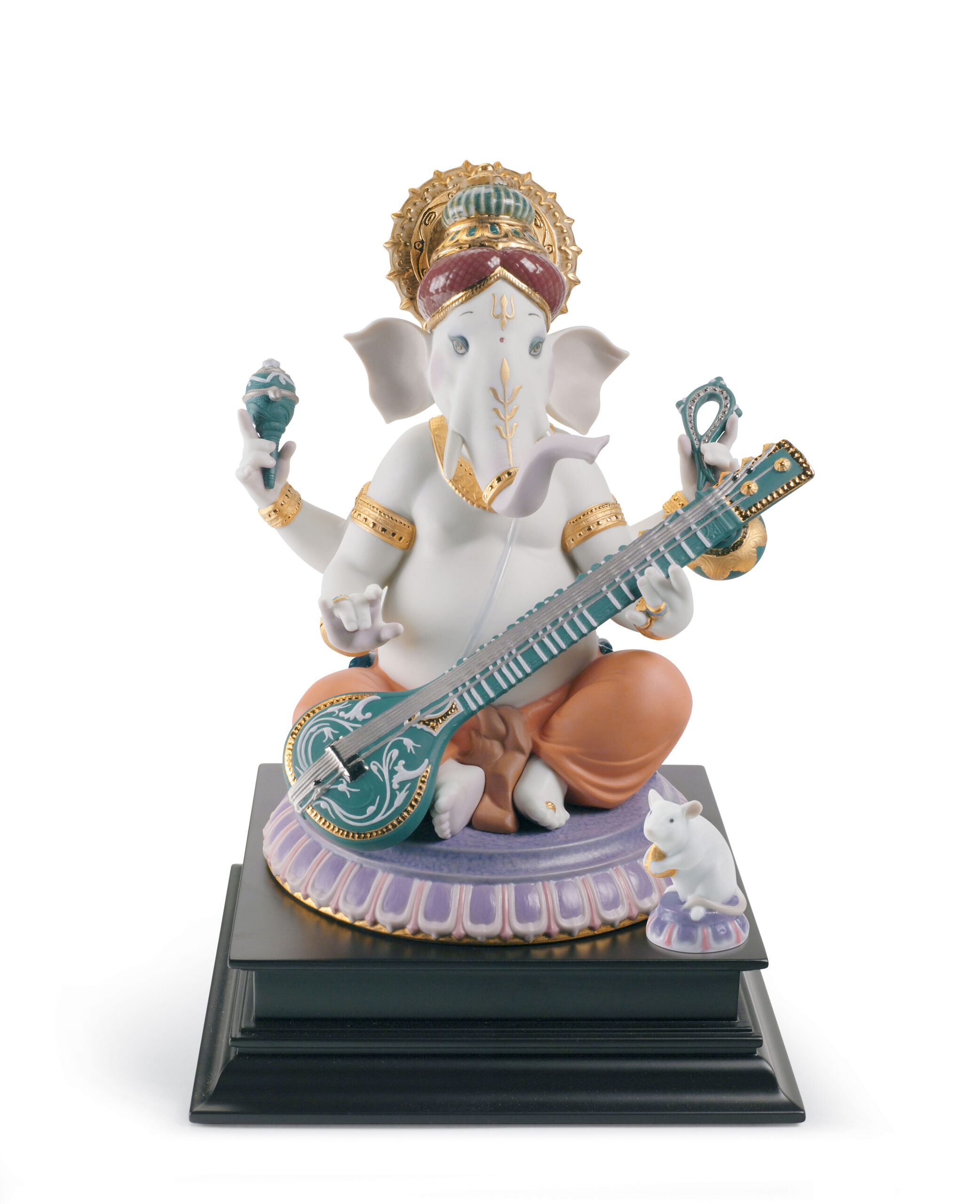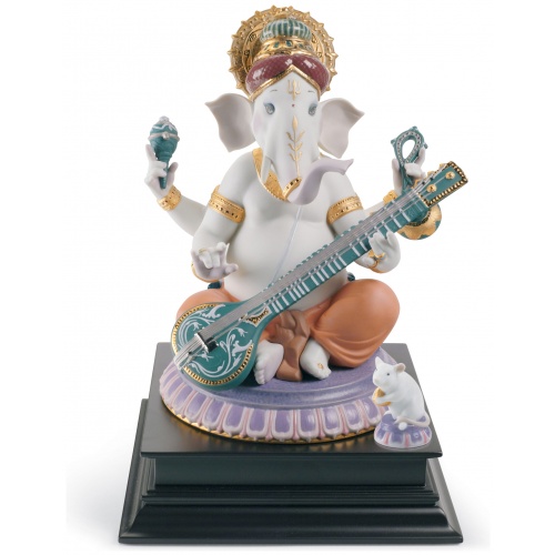 Lord Ganesha is the god of wisdom and knowledge. This deity is very popular in India, and is represented here playing a large Indian guitar called a veena. In addition, the piece portrays other attributes of the traditional iconography of Ganesha, such as the gada (mace), the paasha (rope) and the broken fang, all elements whose symbolism is contained in the avatars, or traditional stories about Ganesha, which are known well by his numerous worshippers.