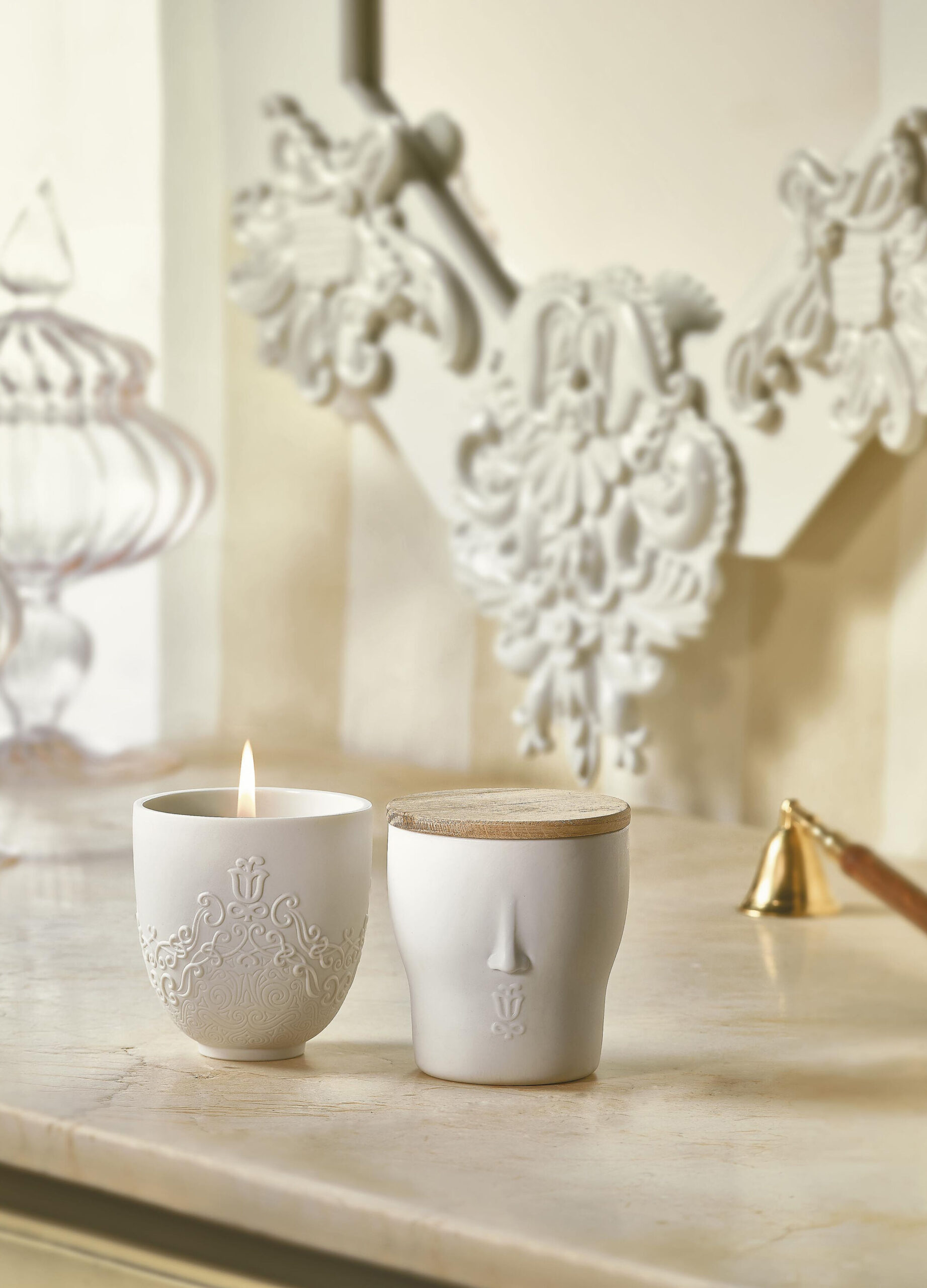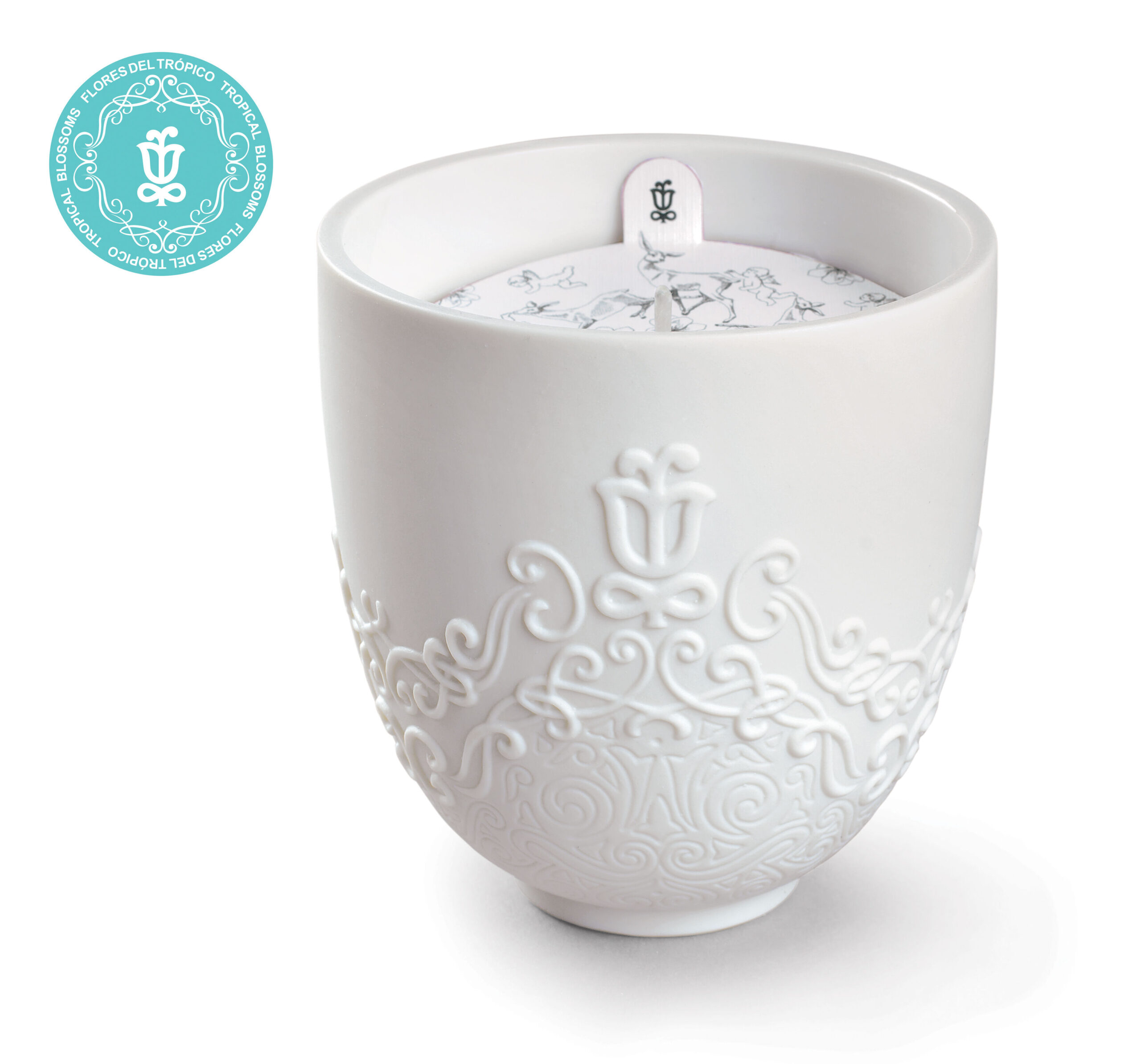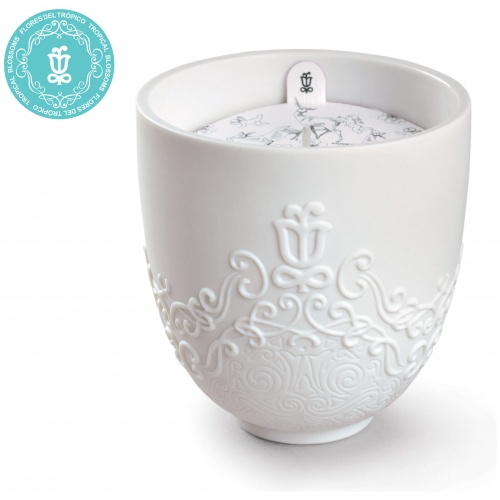 The decoration of the glass is inspired by the winding shape of the scrolls, just as the perfumes spread through the air in our imagination. Flores del TrĂ³pico is a floral perfume of Italian mandarin and frangipani with the tropical fragrance of benzoin. Contains 160 grams (5.64 oz) of natural wax and lasts 35 hours. Includes up to 10% perfume in its formulation and the wick does not produce smoke. Once the wax is consumed, the glasses in this collection become decorative objects that can be used as a box or jeweler with the artistic touch of handmade porcelain in Valencia, Spain.