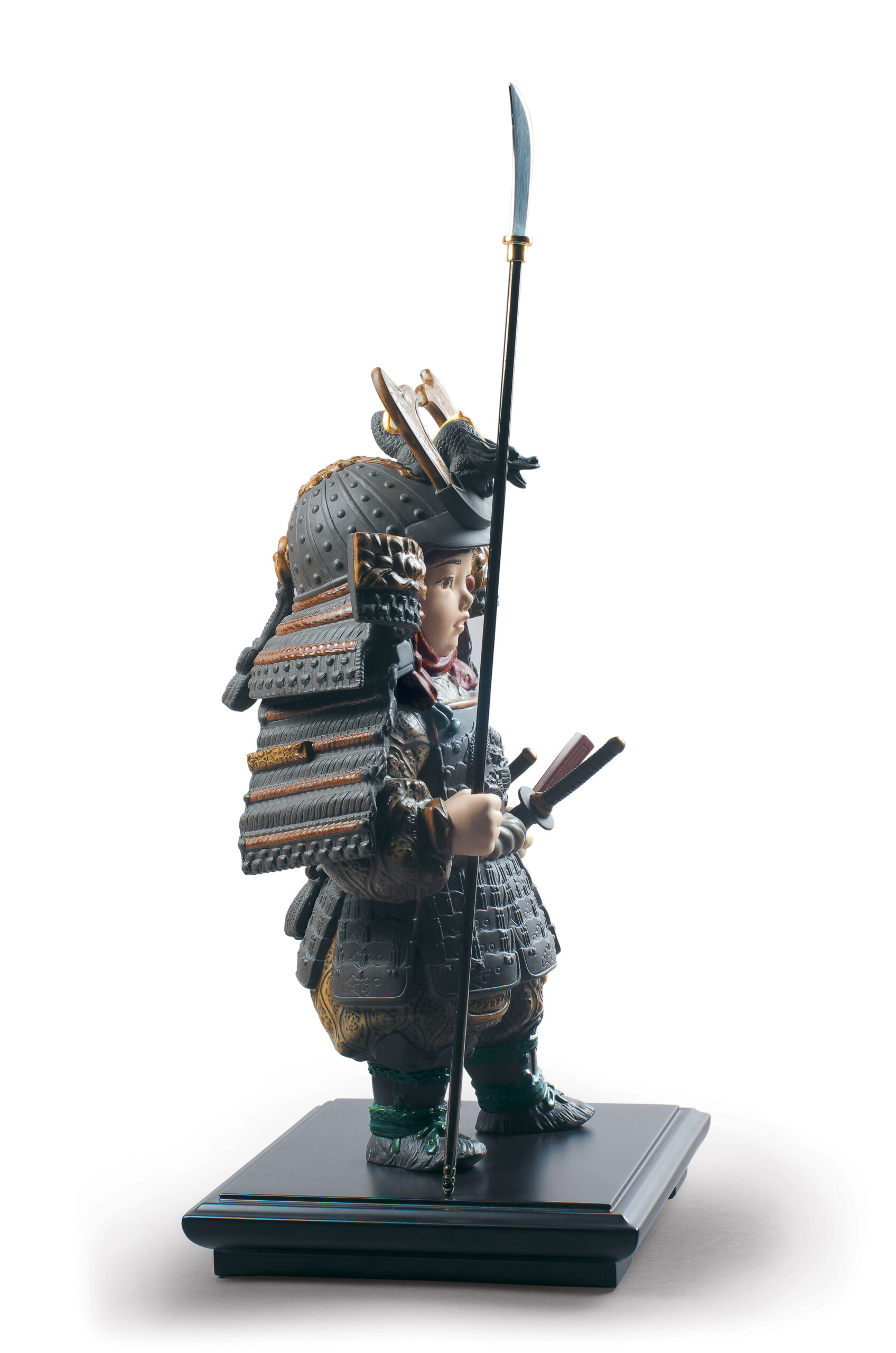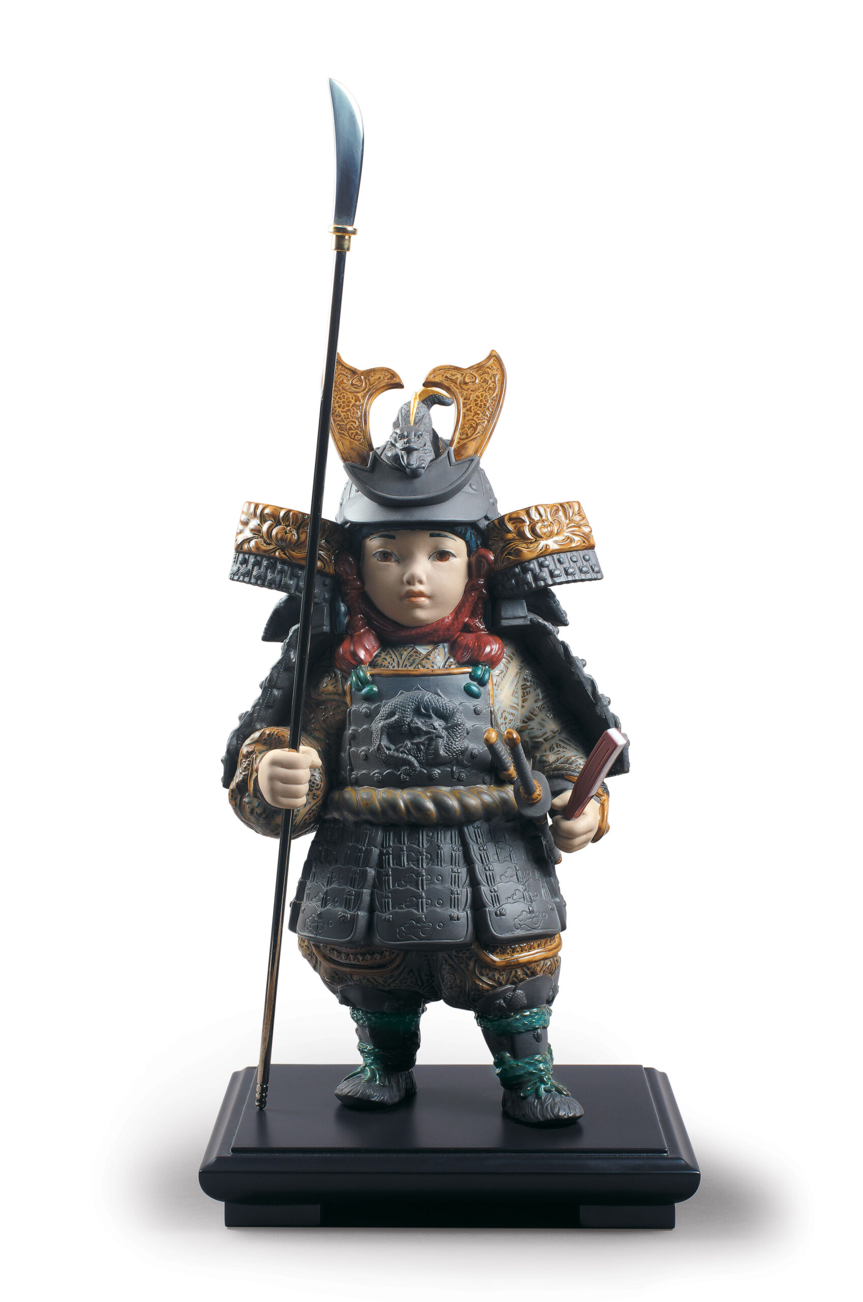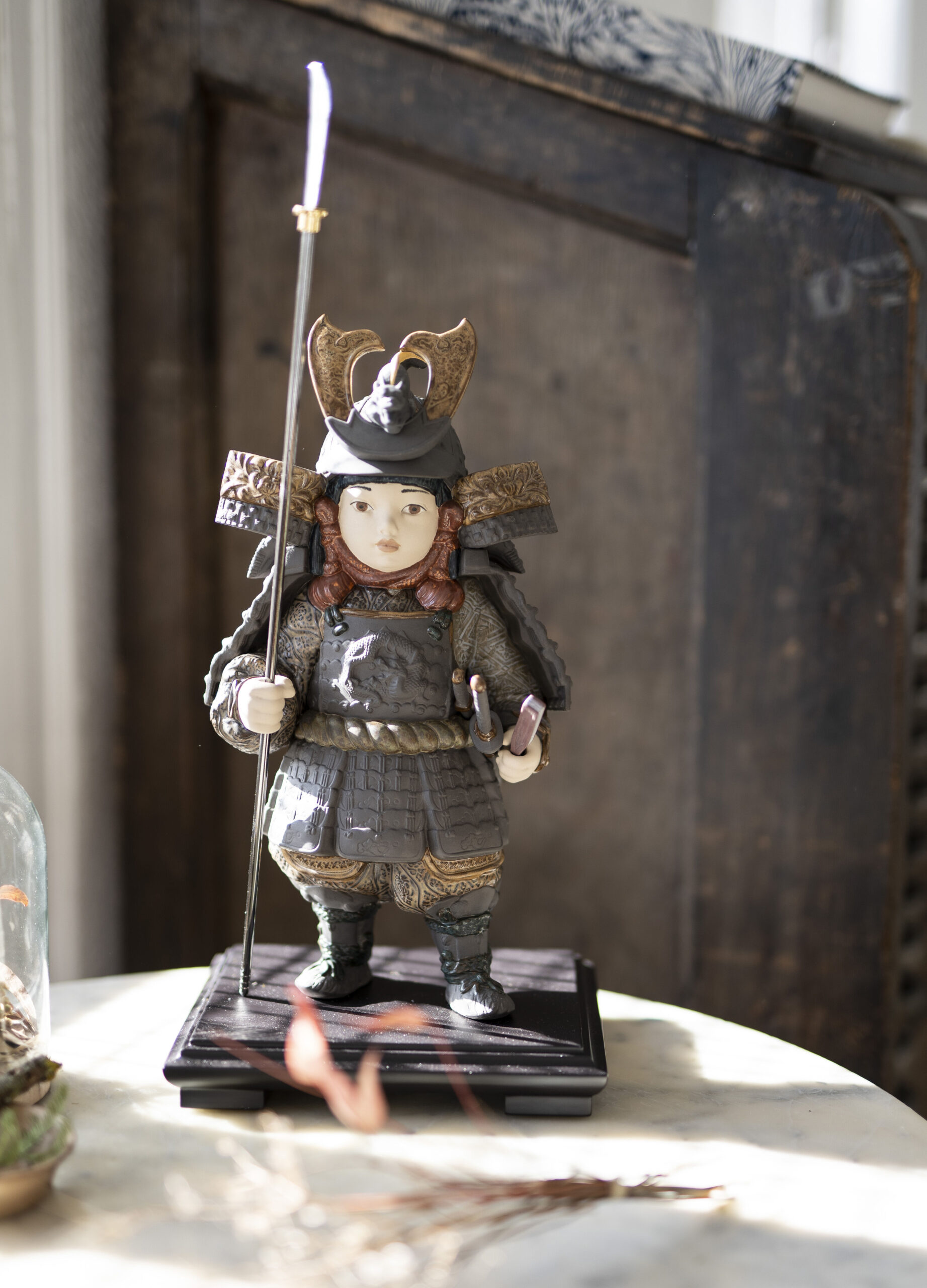 Piece inspired by one of the traditions of Japanese culture. On the fifth day of the fifth month, to mark Children’s Day, dolls dressed in samurai armour are displayed inside the home, granting health for the little ones and symbolizing the virtues of courage and determination. This creation, made in black porcelain with silver lustre, stands out for its strength and elegance, for the refined and meticulous decoration of the armour and for the captivating expression of the boy’s face.