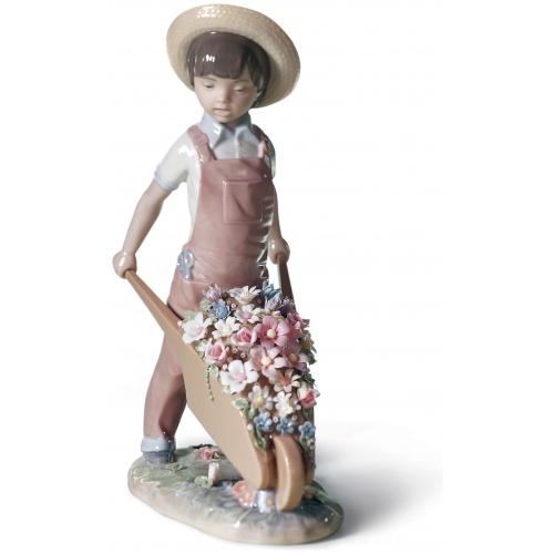 In his wheelbarrow, our little gardener carries a riot of shapes and colours of multiple varieties of exquisite flower. A tour de force by the LladrĂ³ artists, who craft each petal with remarkable care and precision. A glossy porcelain piece, decorated in pastel colours, ideal as a gift, collectible or decoration.