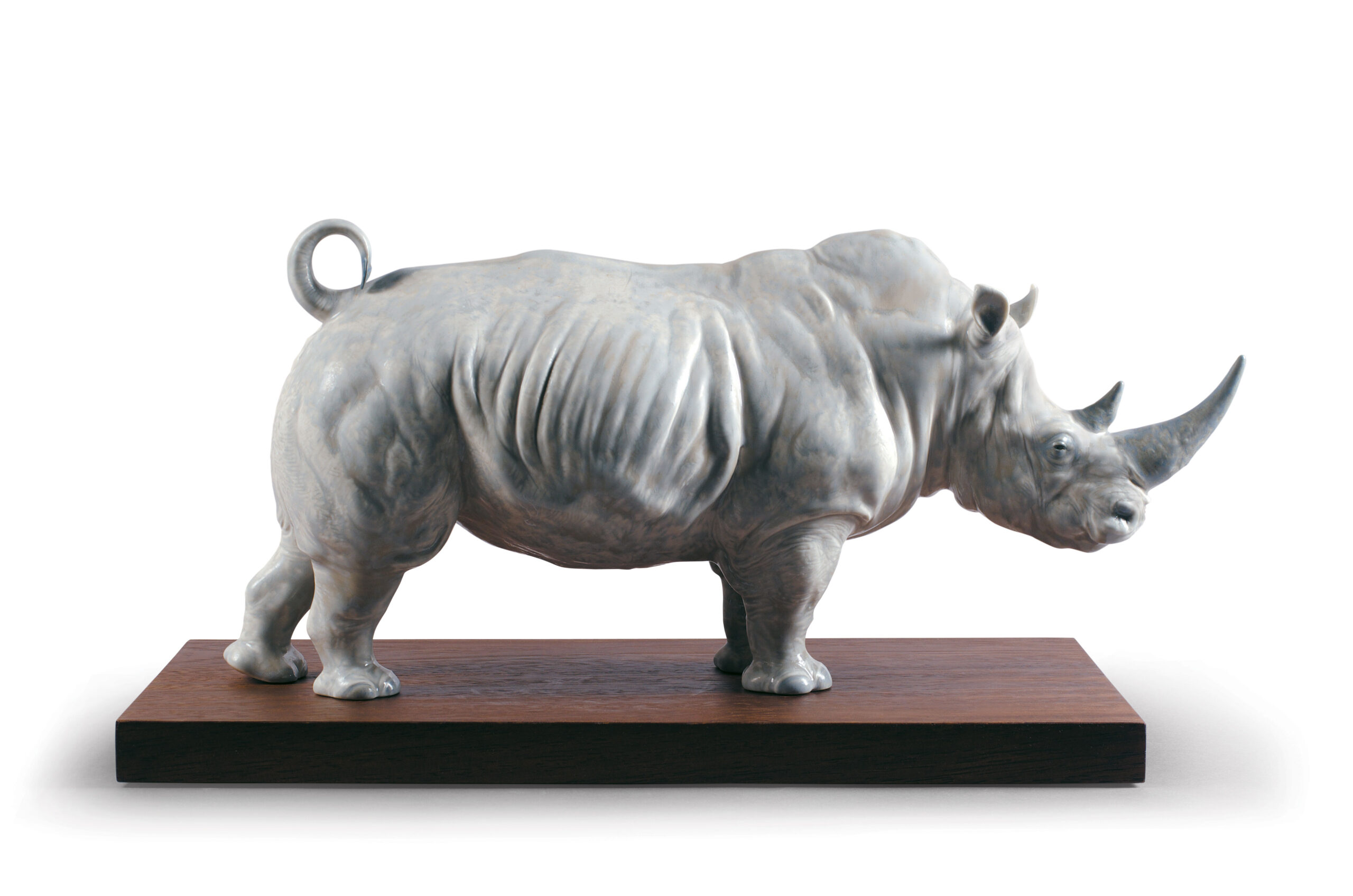 One of the most impressive creatures on earth in the most delicate artistic porcelain. LladrĂ³ pays tribute to the northern white rhinoceros, a species in serious danger of extinction. Its powerful anatomy and characteristic rugged skin come alive in the hands of LladrĂ³ artists, who model and paint each fold, enhancing the realism of a piece of immense sculptural quality. A symbol of survival that deserves to be treasured as a unique gift, perfect for lovers of nature and wild animals. Porcelain decorated in grey enamels and gloss finish.