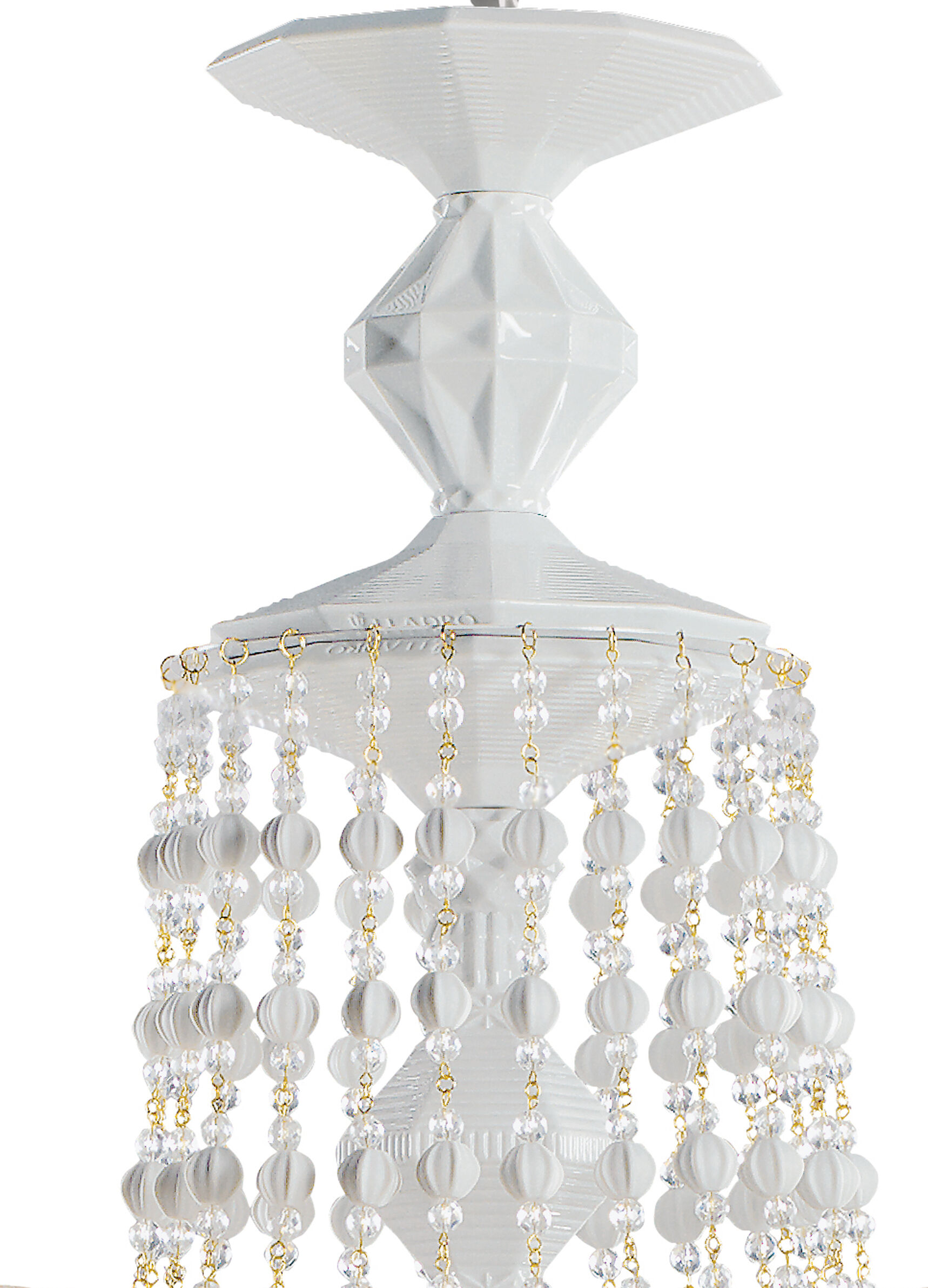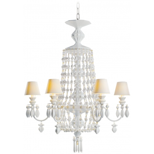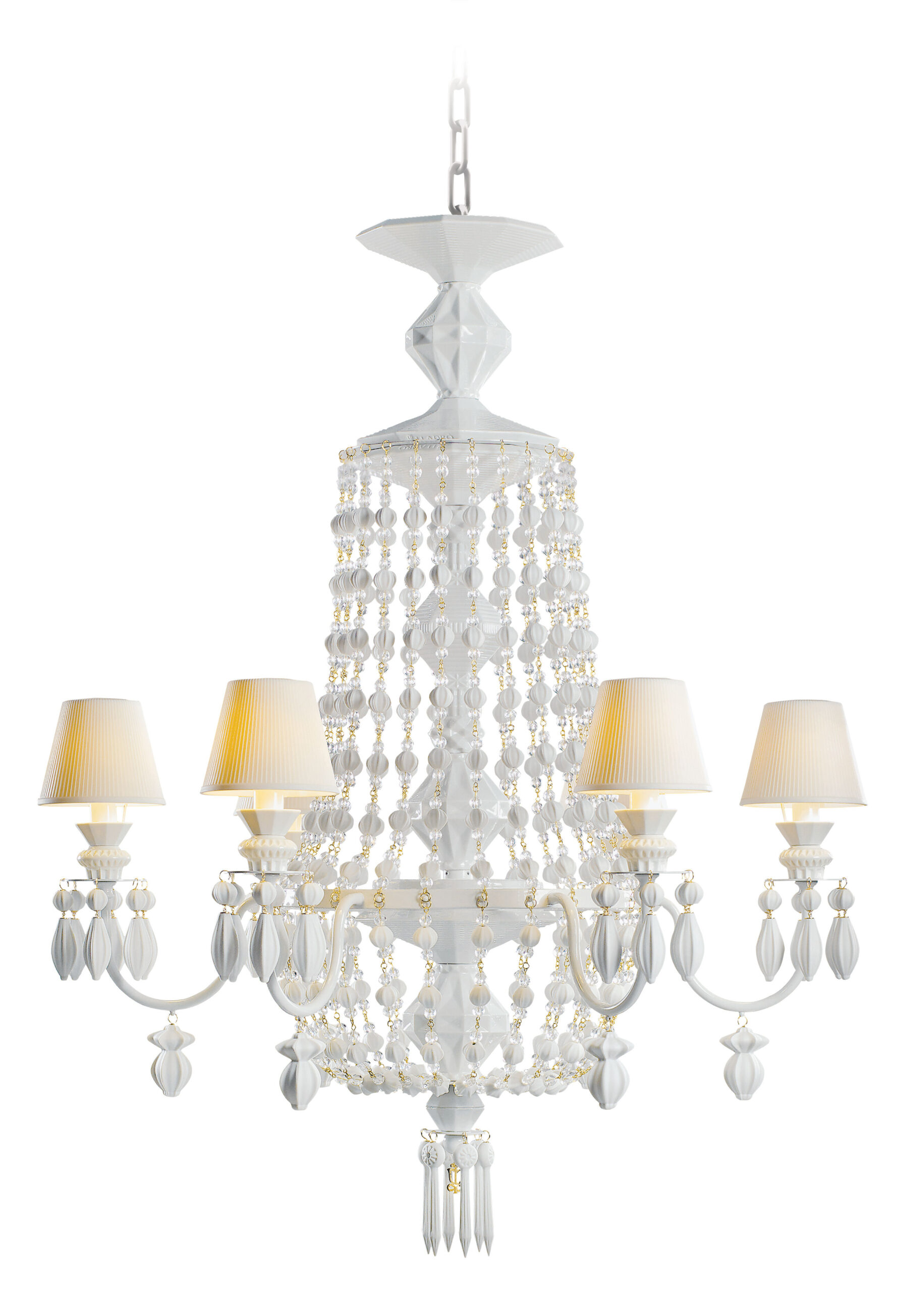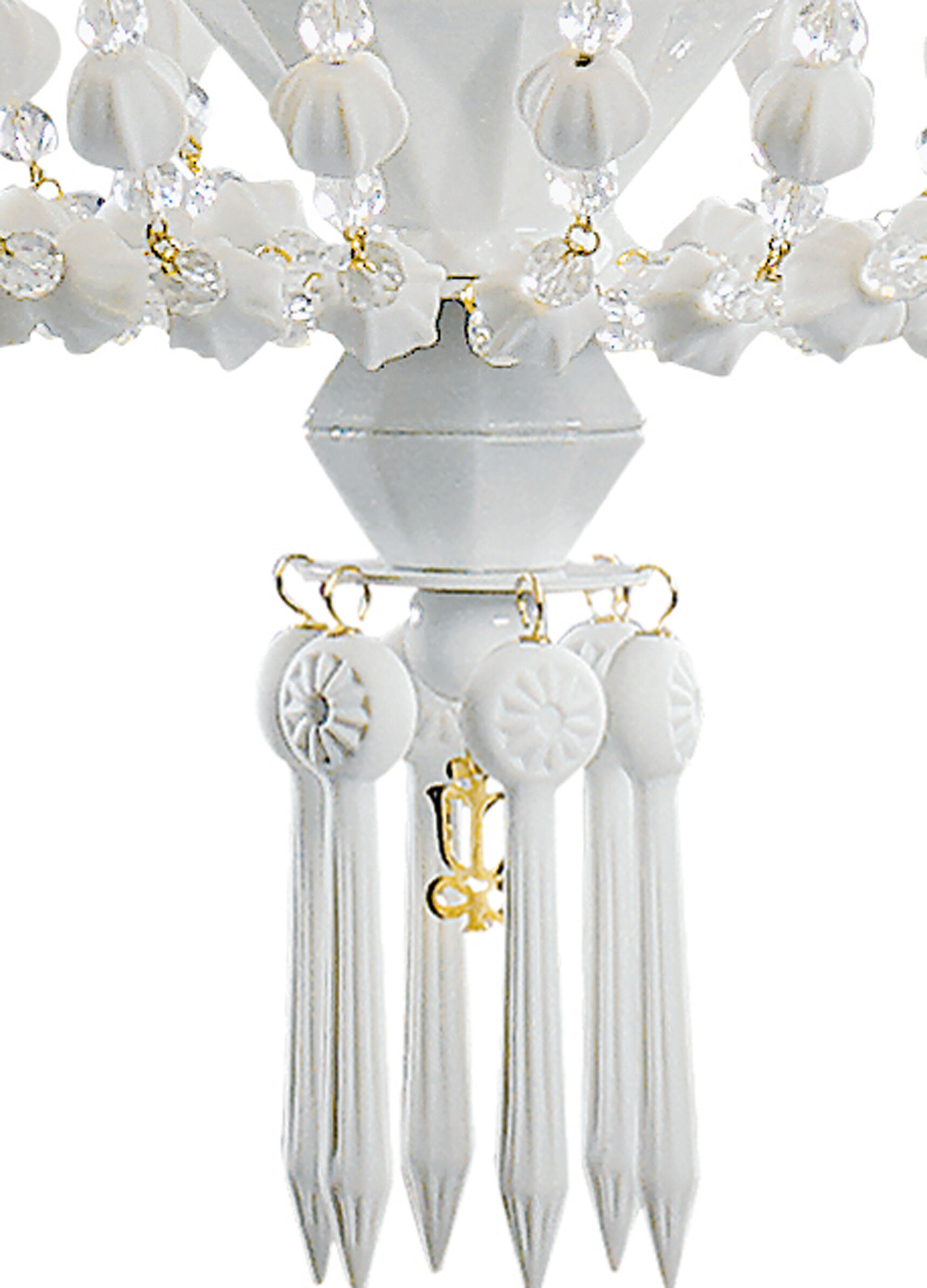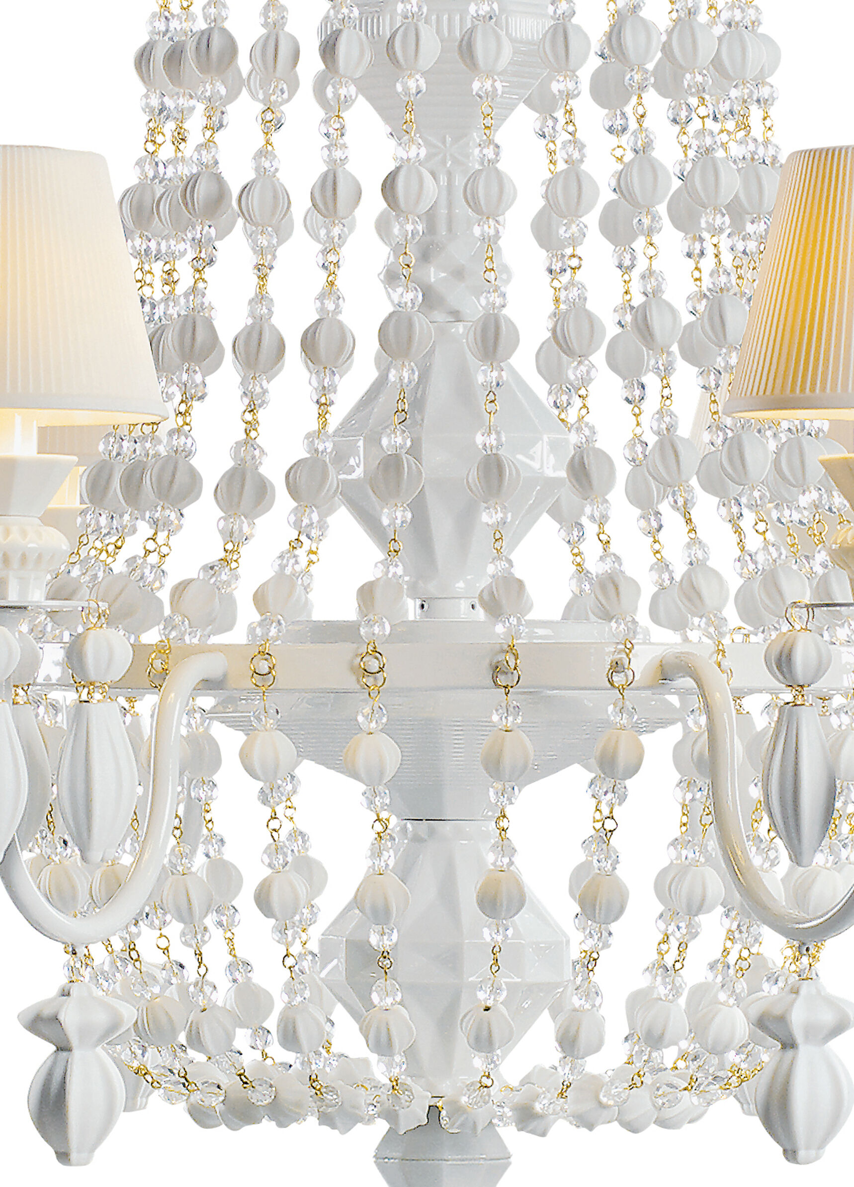 A chandelier inspired by the white of snowy winters, the romance of fairy tales, and the nobility of classical lamps. The Winter Palace chandelier seems to have been taken directly from the Palace of Versailles or the residences of the Russian tsars. It has a matte and gloss porcelain finish with golden lustre and each golden part is hand painted. Thanks to the kiln, the golden base is transformed into a permanent element of the porcelain. The chandelier combines opaque and translucent porcelain. Small glass spheres are used to separate the porcelain pearls. Available with 6, 12 and 30 lights.