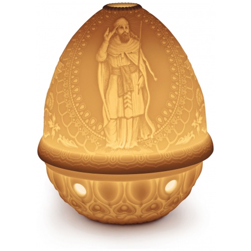 The magic of lithophany is born from the play of light with the translucent character of porcelain. By illuminating its interior, it projects warm lighting throughout the room and highlights the engraving that decorates it, producing surprising relief effects on its surface. This piece represents the mysterious prophet Zarathustra, founder thousands of years ago of Mazdeism, a doctrine according to which the conflict between Good and Evil marks the life of men.
